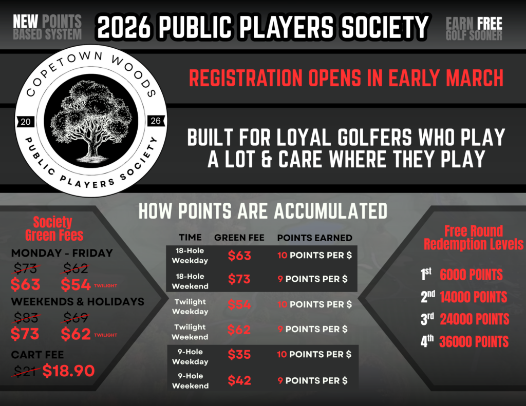 THE NEWLY STRUCTURED PUBLIC PLAYERS SOCIETY FOR 2026 INTRODUCES A NEW POINTS BASED SYSTEM THAT REWARDS LOYALTY EACH ROUND BY EARNING YOU POINTS ON A PER-DOLLAR SPENT BASIS THAT CAN BE REDEEMED FOR FREE ROUNDS OF GOLF, ALL WHILE SAVING MONEY ON EACH GREEN FEE & CART FEE FOR THE ENTIRE SEASON.